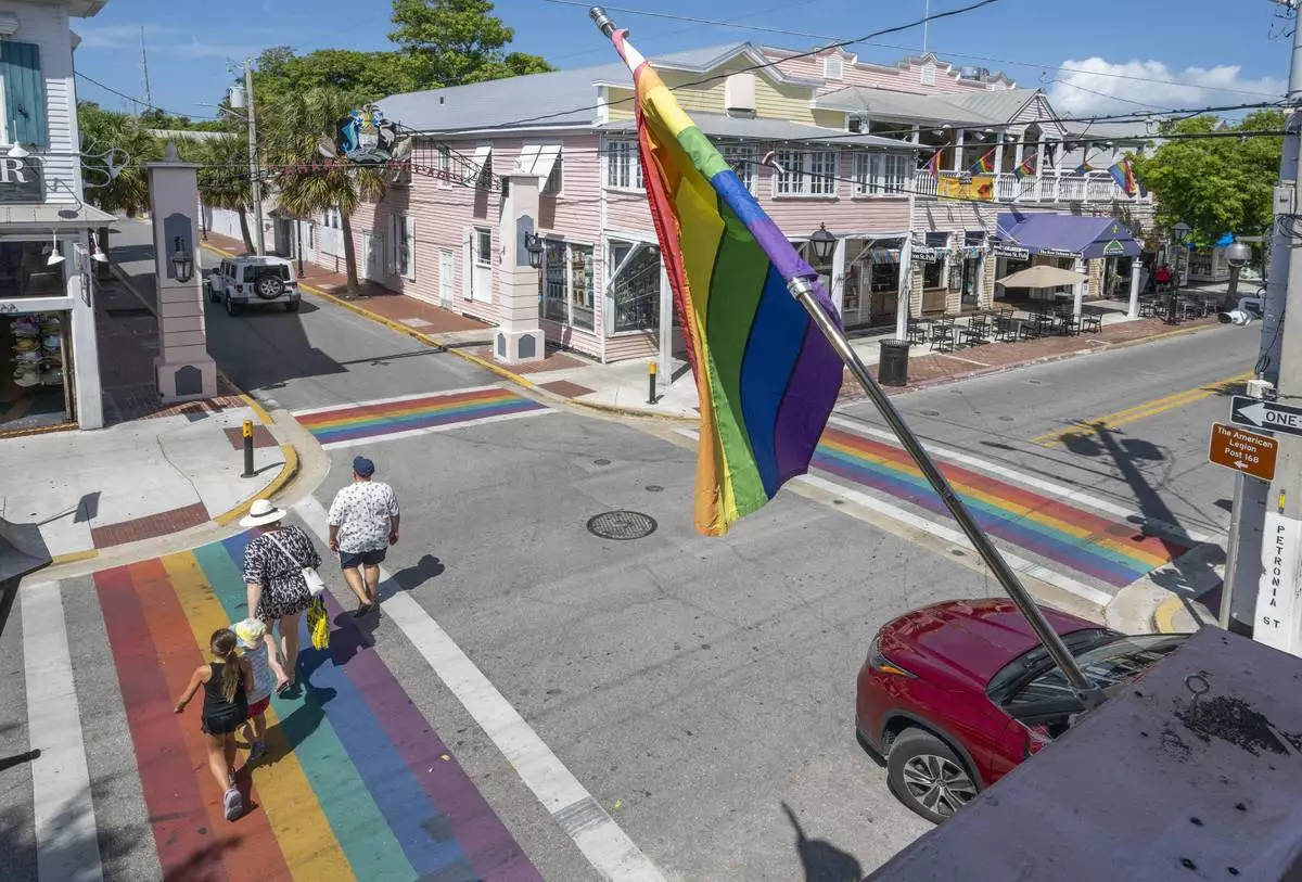 A family crosses one of four rainbow crosswalks on Duval Street in Key West, Fla., Tuesday, Aug. 26, 2025. (Rob O'Neal/The Key West Citizen via AP)
