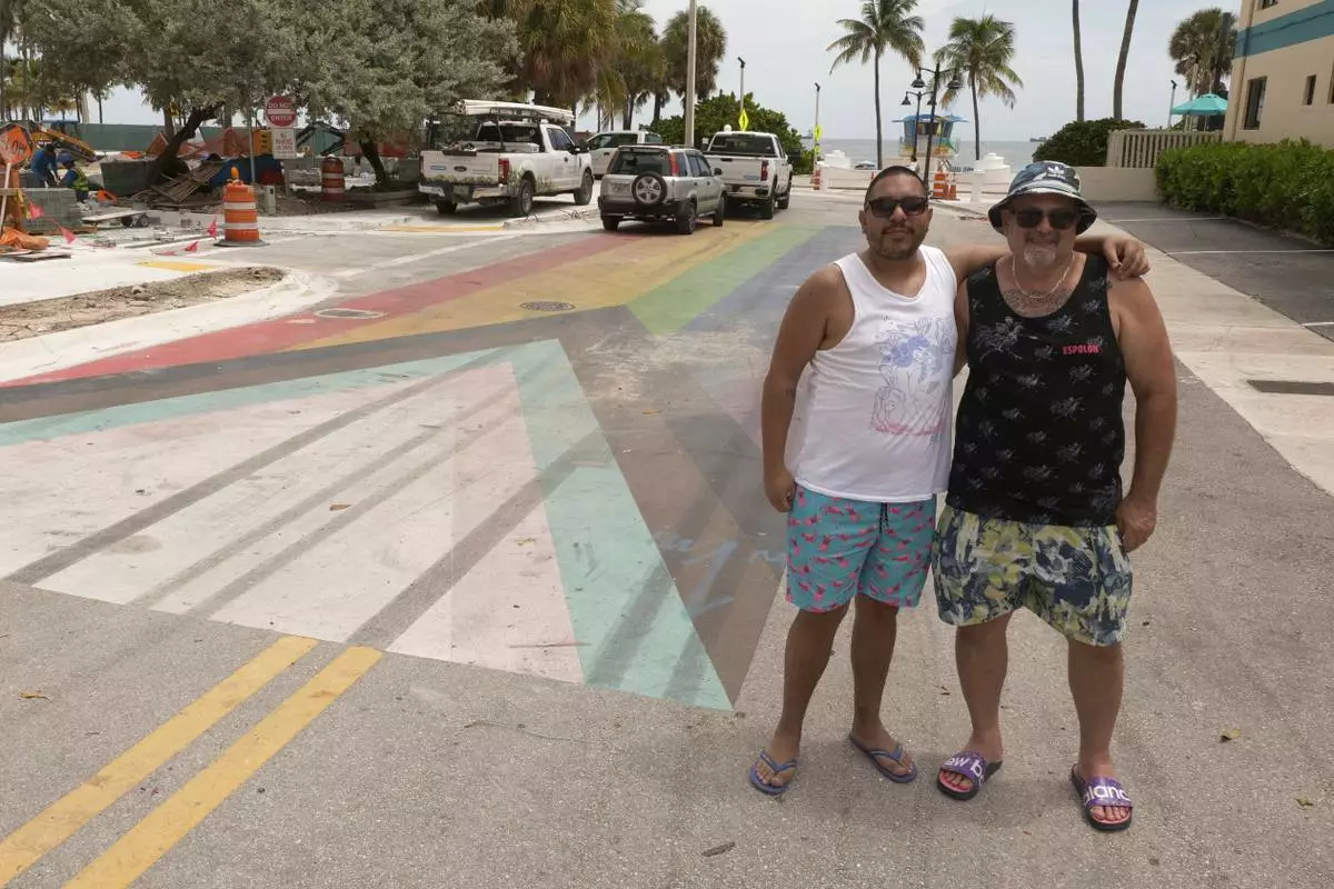 South Florida residents Jay Fuertes, left, and Jason Osborne pose in front of a rainbow-colored crosswalk celebrating gay rights and LGBTQ+ pride located a block from the beach on Aug. 27, 2025, in Fort Lauderdale, Fla. (AP Photo/Daniel Kozin)