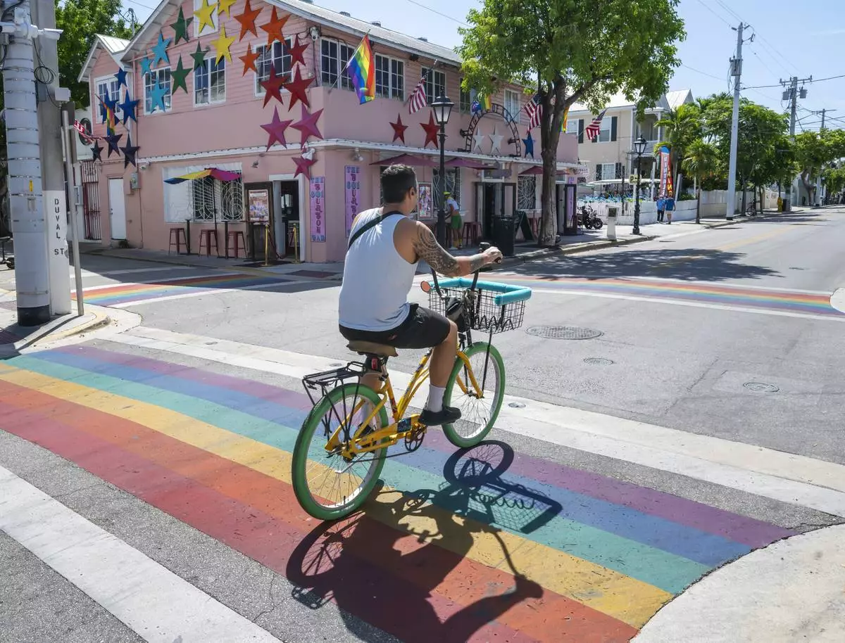 A bicyclist passes over a rainbow crosswalk on Duval Street in Key West, Fla., Tuesday, Aug. 26, 2025. (Rob O'Neal/The Key West Citizen via AP)