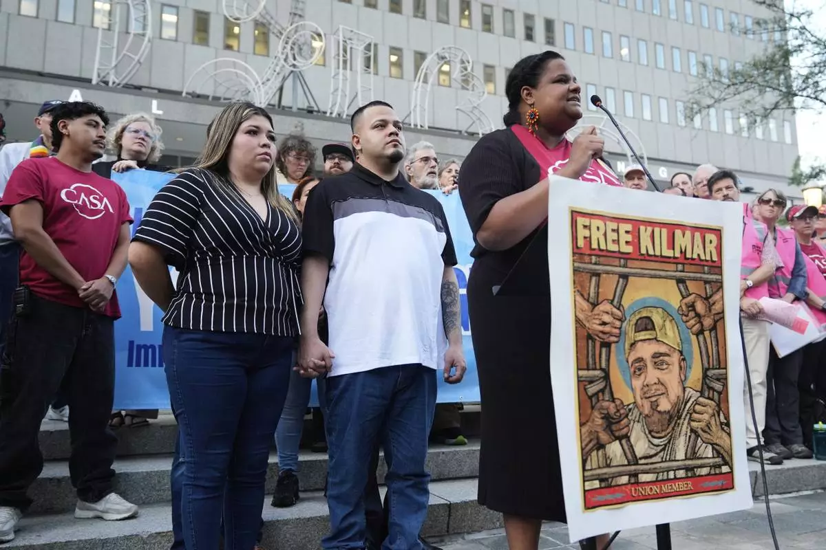 Kilmar Abrego Garcia attends a protest rally at the Immigration and Customs Enforcement field office in Baltimore, Monday, Aug. 25, 2025, to support Abrego Garcia. (AP Photo/Stephanie Scarbrough)