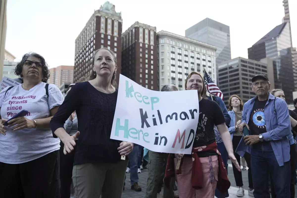 People attend a protest rally at the Immigration and Customs Enforcement field office in Baltimore, Monday, Aug. 25, 2025, to support Kilmar Abrego Garciab. (AP Photo/Stephanie Scarbrough)