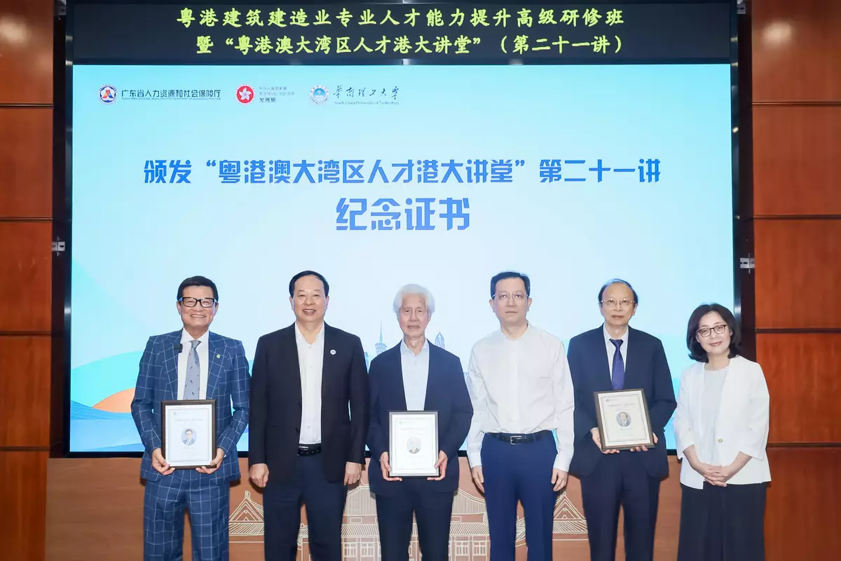 In the morning, Ms Linn attended the Launching Ceremony of the Advanced Capability Building Programme for Project Leaders and Talents in the Guangdong-Hong Kong Construction Industry and Guangdong-Hong Kong-Macao Greater Bay Area (GBA) Talent Hub Forum. Jointly organised by the Development Bureau (DEVB) of the Hong Kong Special Administrative Region (HKSAR) Government, the Human Resources and Social Security Department of Guangdong Province (GDHRSSD) and the South China University of Technology (SCUT), the programme provides professional training focused on cutting-edge trends of the industry and practical innovation for about 60 senior personnel from construction-related enterprises in Guangdong as well as professionals from the Government and the construction industry who are taking the courses of the Centre of Excellence for Major Project Leaders under the DEVB. The programme will help construction industry talents from Guangdong and Hong Kong gain a deeper understanding of and better integrate into the industry development in the GBA. It will also enhance their professional expertise and practical capabilities, contributing to the high-quality development of the GBA. At the ceremony, Ms Linn, together with the Director-General of the GDHRSSD, Mr Du Minqi, and the Secretary of the CPC SCUT Committee, Mr Zhang Xichun, presented commemorative certificates to three speakers, namely Honorary Dean of School of Architecture of SCUT, Professor He Jingtang; Chair Professor of the Department of Urban Planning and Design of the University of Hong Kong, Professor Anthony Yeh Gar-on; and the Executive Director of the Construction Industry Council, Mr Albert Cheng.