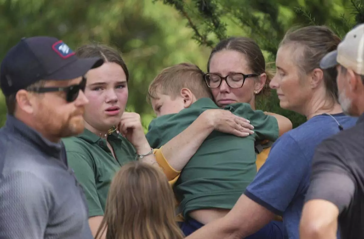 Parents comfort their children after a shooting at Annunciation Church on Wednesday, Aug. 27, 2025 in Minneapolis. (Alex Kormann/Star Tribune via AP)/