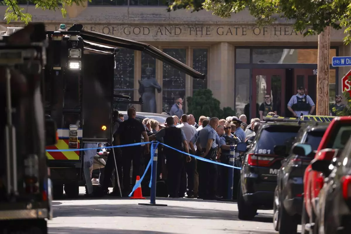 Law enforcement officers gather outside the Annunciation Church in response to a reported mass shooting, Wednesday, Aug. 27, 2025, in Minneapolis. (AP Photo/Bruce Kluckhohn)
