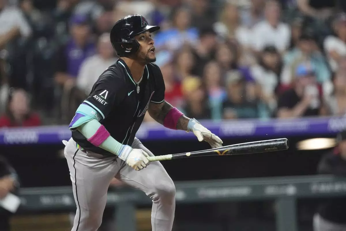Arizona Diamondbacks' Ketel Marte singles against Colorado Rockies pitcher Tanner Gordon in the sixth inning of a baseball game Friday, Aug. 15, 2025, in Denver. (AP Photo/David Zalubowski)
