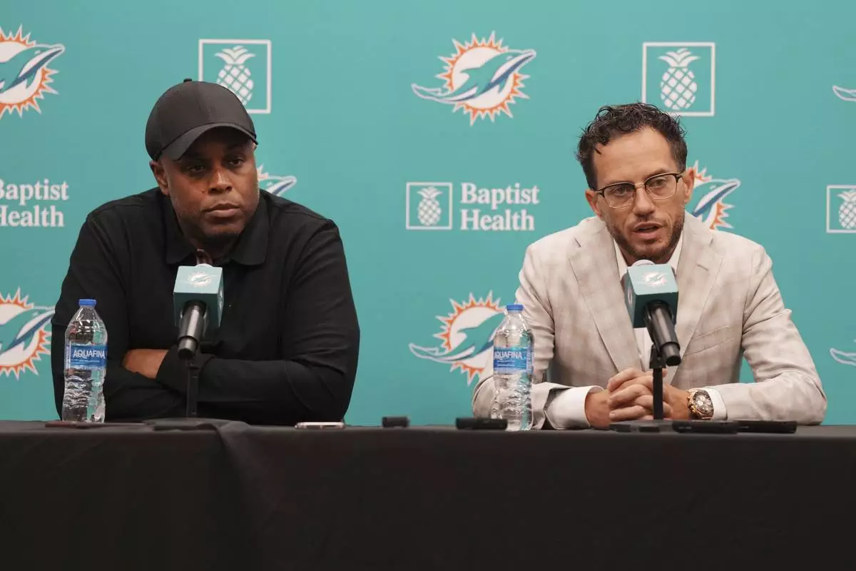 FILE - Miami Dolphins general manager Chris Grier, left, and head coach Mike McDaniel take questions during an NFL football news conference on April 25, 2025, in Miami Gardens, Fla. (AP Photo/Jim Rassol, File)