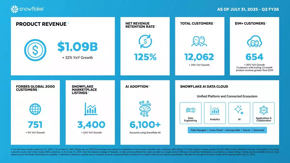 Snowflake (NYSE: SNOW), the AI Data Cloud company, today announced financial results for its second quarter of fiscal 2026, ended July 31, 2025.