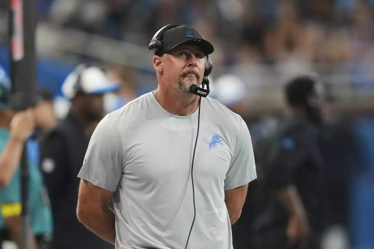Detroit Lions head coach Dan Campbell watches from the sideline during the first half of an NFL preseason football game against the Miami Dolphins Saturday, Aug. 16, 2025, in Detroit. (AP Photo/Paul Sancya)