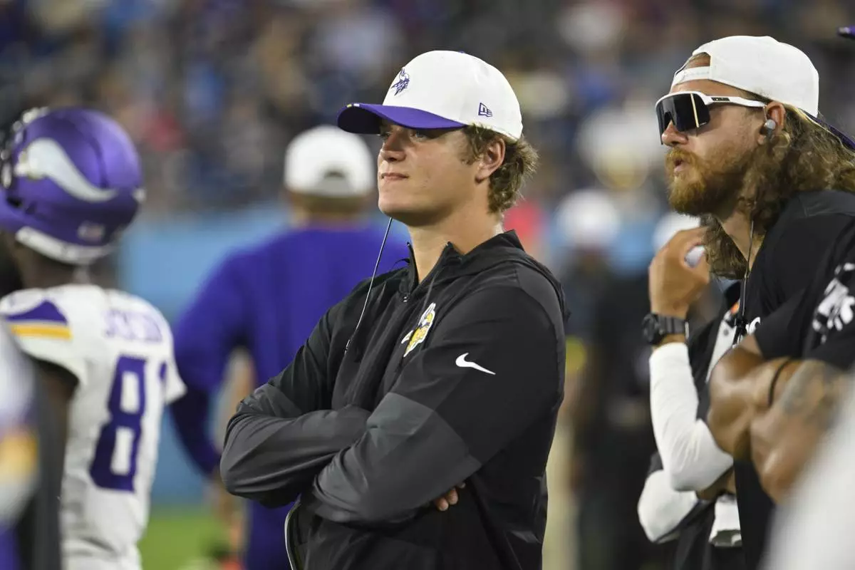 Minnesota Vikings quarterback J.J. McCarthy (9) on the sidelines during the second half of a preseason NFL football game against the Tennessee Titans, Friday, Aug. 22, 2025, in Nashville, Tenn. (AP Photo/John Amis)