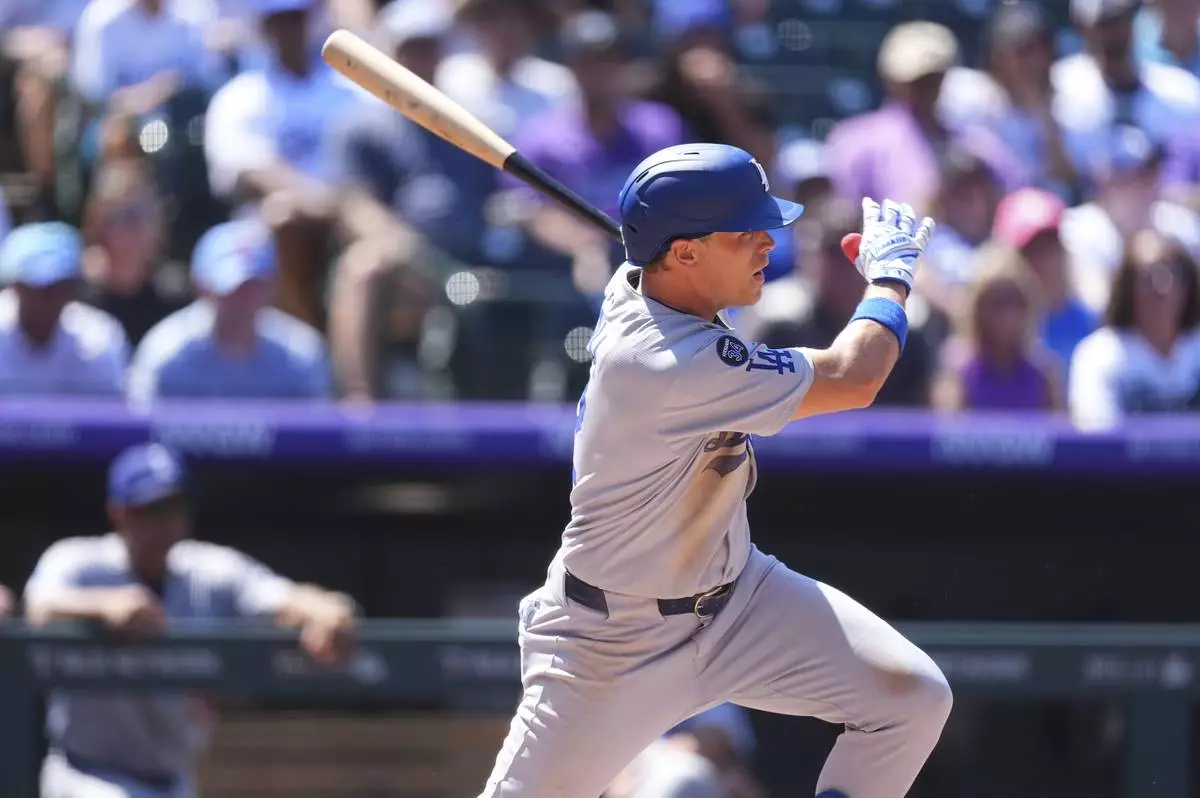 Los Angeles Dodgers' Alex Call follows the flight of his RBI single of Colorado Rockies starting pitcher Chase Dollander in the third inning of a baseball game Thursday, Aug. 21, 2025, in Denver. (AP Photo/David Zalubowski)