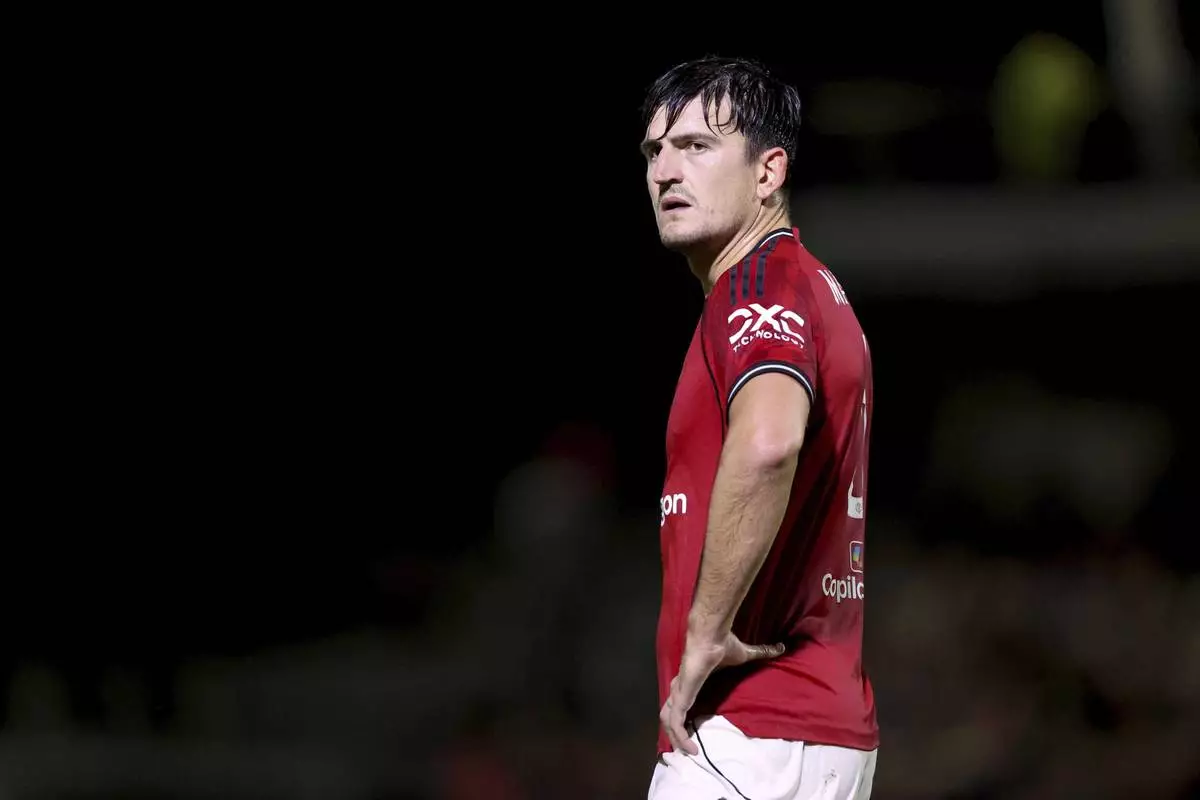 Manchester United's Harry Maguire reacts during an English League Cup second round soccer match against Grimsby Town, Wednesday, Aug. 27, 2025, at Hill Blundell Park in Grimsby, England. (Nigel French/PA via AP)