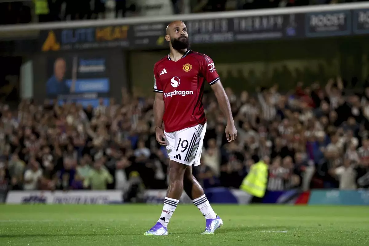 Manchester United's Bryan Mbeumo reacts after missing his second penalty kick against Grimsby Town in the English League Cup second round soccer match, Wednesday, Aug. 27, 2025, at Hill Blundell Park in Grimsby, England. (Nigel French/PA via AP)
