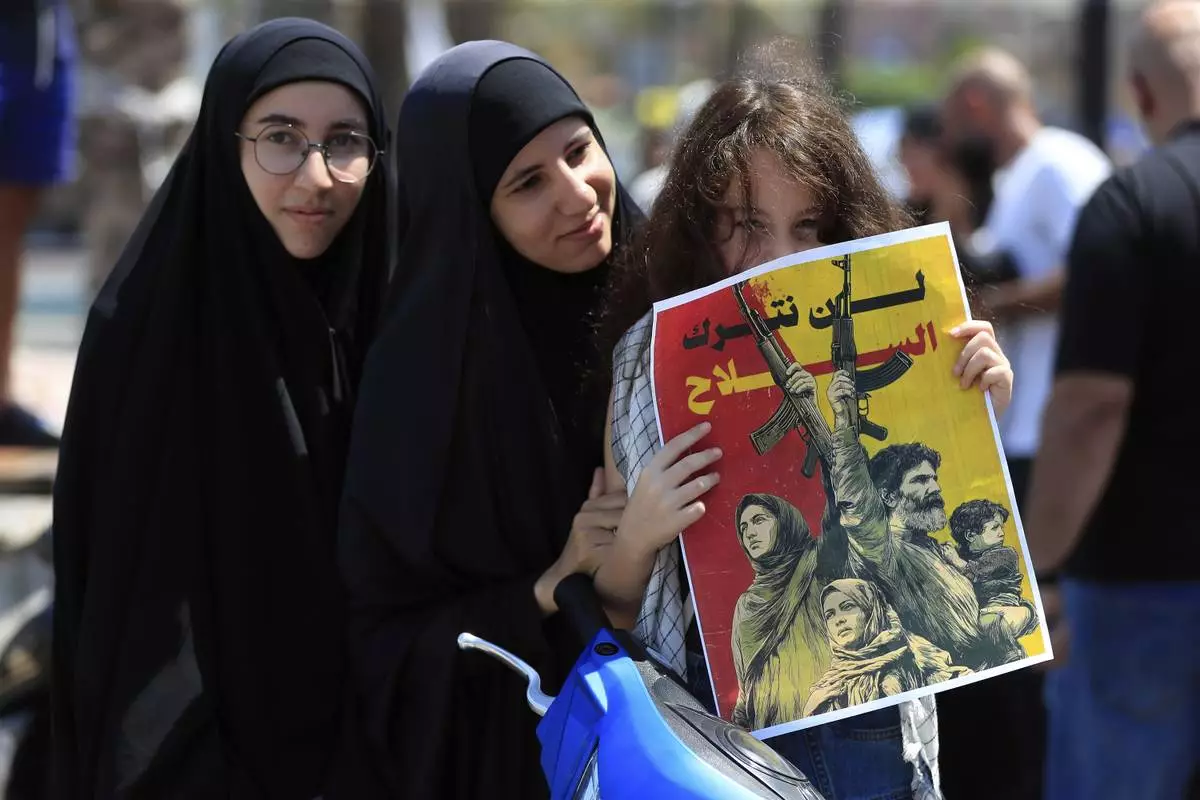 Shiite women attend a protest against Tom Barrack, U.S. President Donald Trump's envoy to the Middle East, who was supposed to visit Tyre city in south Lebanon, Wednesday, Aug. 27, 2025. The poster reads in Arabic: "We will not leave the weapons." (AP Photo/Mohammed Zaatari)