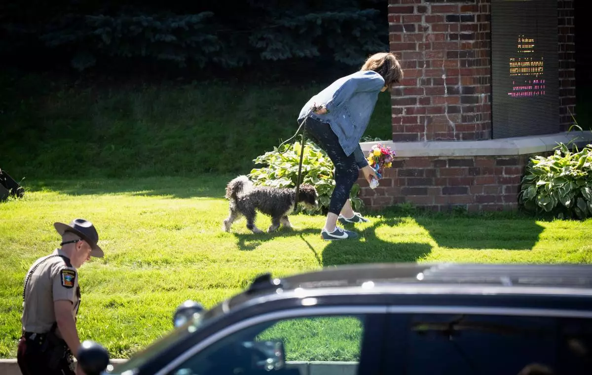 A woman is allowed to drop off flowers at the Annunciation Catholic School sign near the scene of a shooting at Annunciation Catholic Church, Wednesday, Aug. 27, 2025, in Minneapolis. (Renée Jones Schneider/Star Tribune via AP)