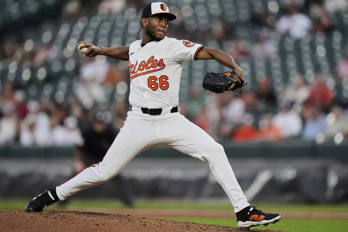 Baltimore Orioles relief pitcher Roansy Contreras (66) delivers during the fourth inning of a baseball game Boston Red Sox, Wednesday, Aug. 27, 2025, in Baltimore. (AP Photo/Stephanie Scarbrough)