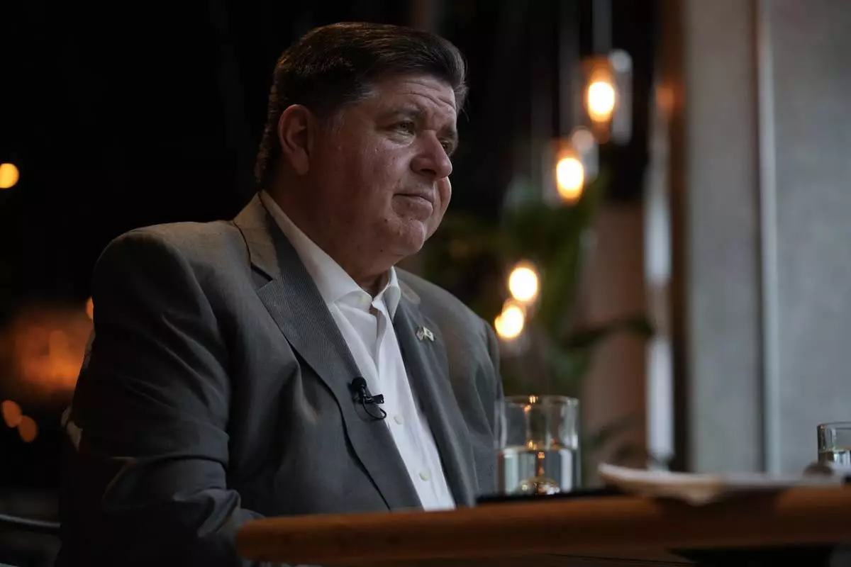 Illinois Gov. J.B. Pritzker sits for an interview with the Associated Press, Wednesday, Aug. 27, 2025, in the Bronzeville neighborhood of Chicago. (AP Photo/Erin Hooley)