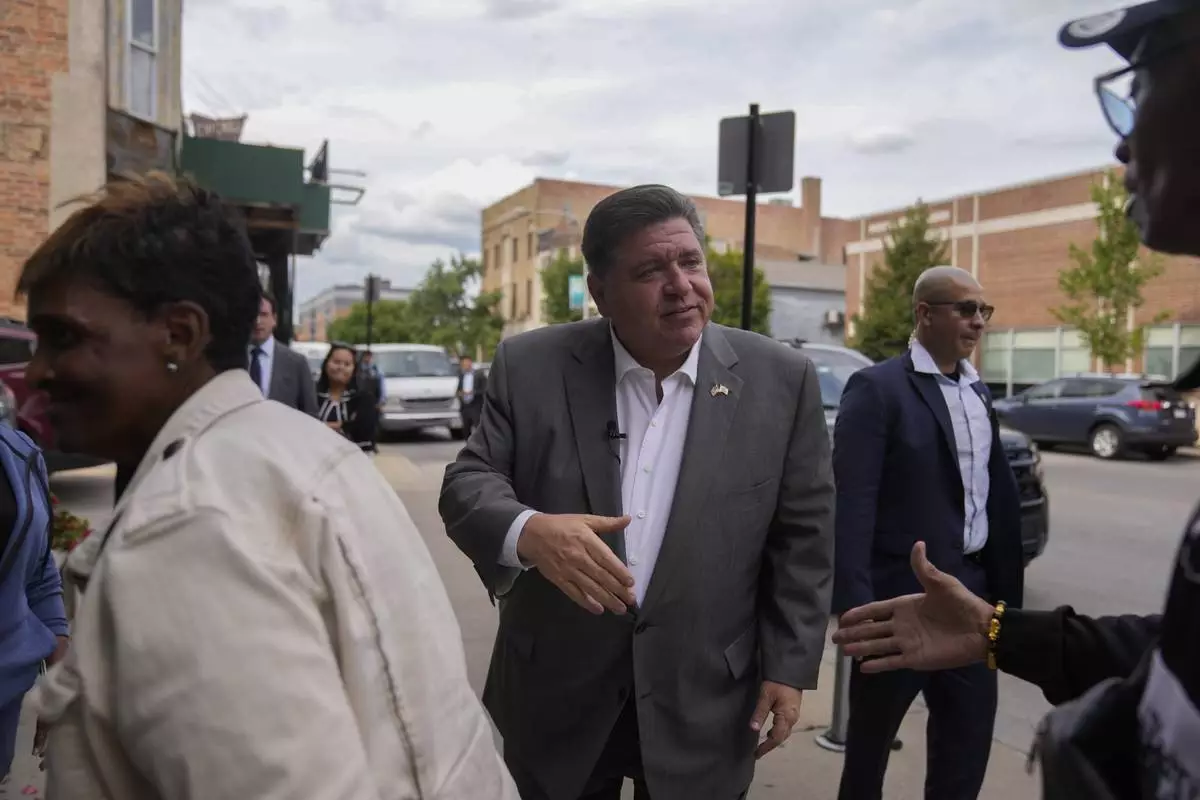 Illinois Gov. J.B. Pritzker greets people outside of Cleo's Southern Cuisine, Wednesday, Aug. 27, 2025, in the Bronzeville neighborhood of Chicago. (AP Photo/Erin Hooley)