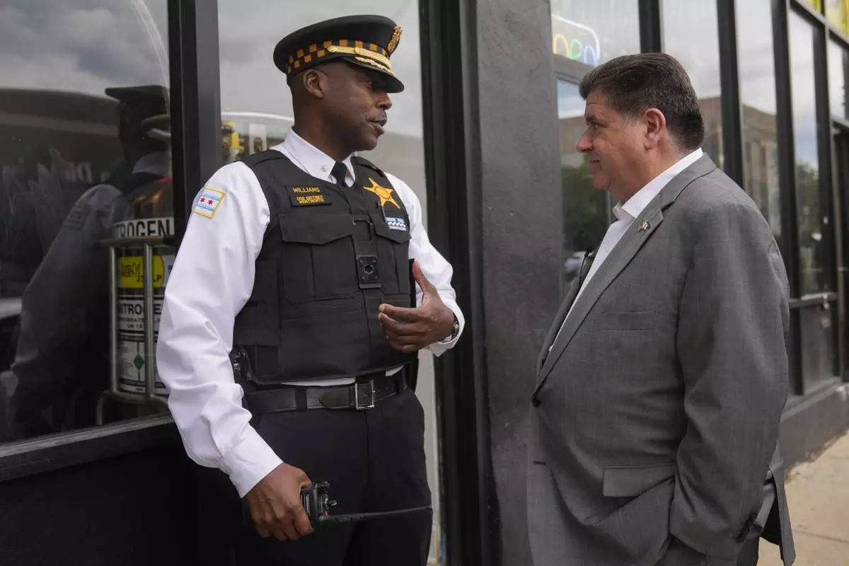 Chicago Police Cmdr, Herbert Williams, left, speaks with Illinois Gov. J.B. Pritzker Wednesday, Aug. 27, 2025, in the Bronzeville neighborhood of Chicago. (AP Photo/Erin Hooley)