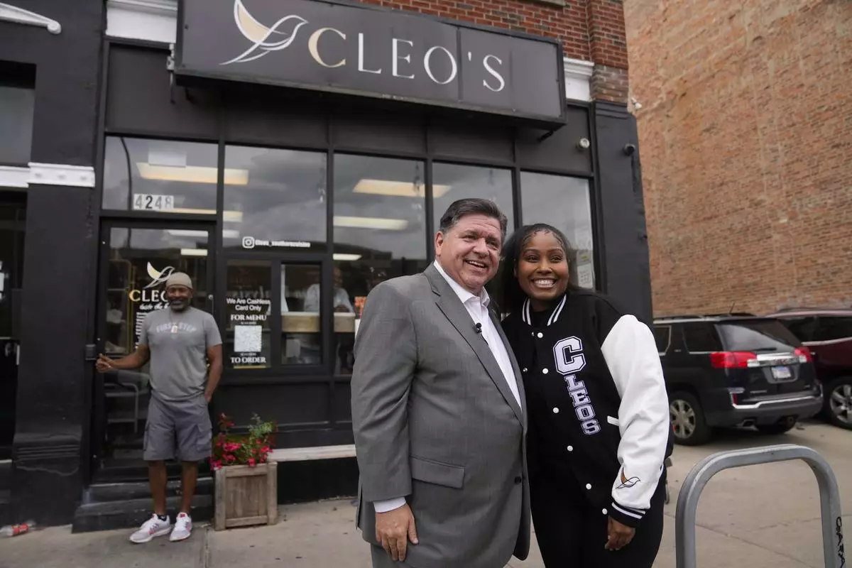 Illinois Gov. J.B. Pritzker, left, poses for a photo with Chef Kristen Ashley at her restaurant, Cleo's Southern Cuisine, Wednesday, Aug. 27, 2025, in the Bronzeville neighborhood of Chicago. (AP Photo/Erin Hooley)