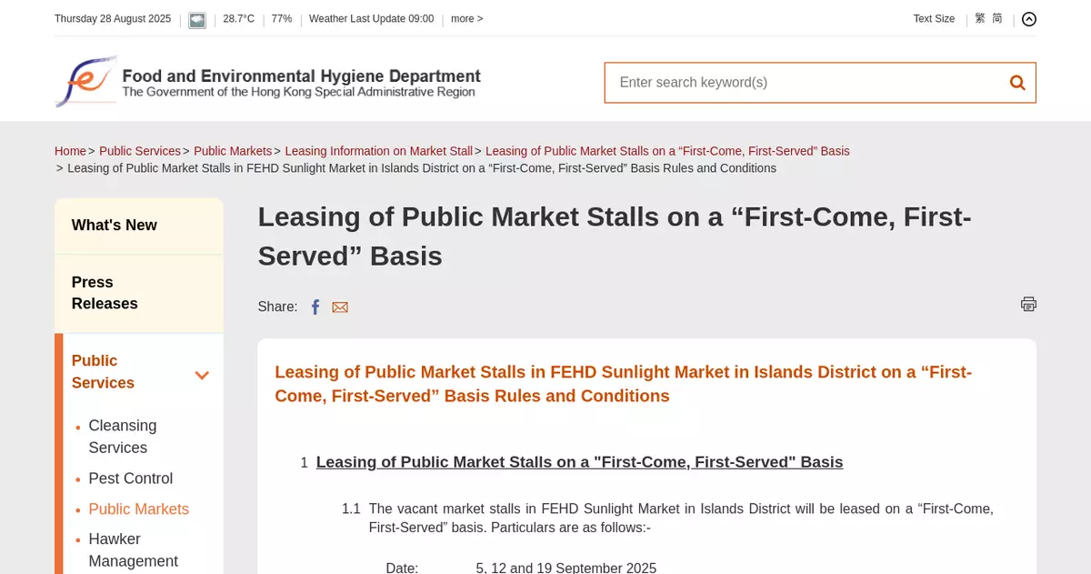 Details of renting market stalls in the FEHD Sunlight Market on a first-come, first-served basis have been uploaded to the FEHD website (www.fehd.gov.hk/english/pleasant_environment/tidy_market/FCFS/202509_sunlight.html). Interested applicants may visit the department website or contact the Islands District Environmental Hygiene Office.