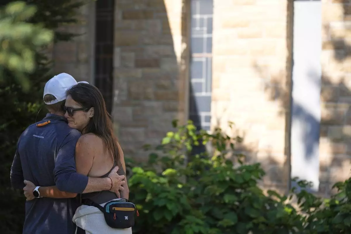 Kristen Neville and Michael Burt embrace each other at Annunciation Catholic Church after Wednesday's school shooting, Thursday, Aug. 28, 2025, in Minneapolis. (AP Photo/Abbie Parr)