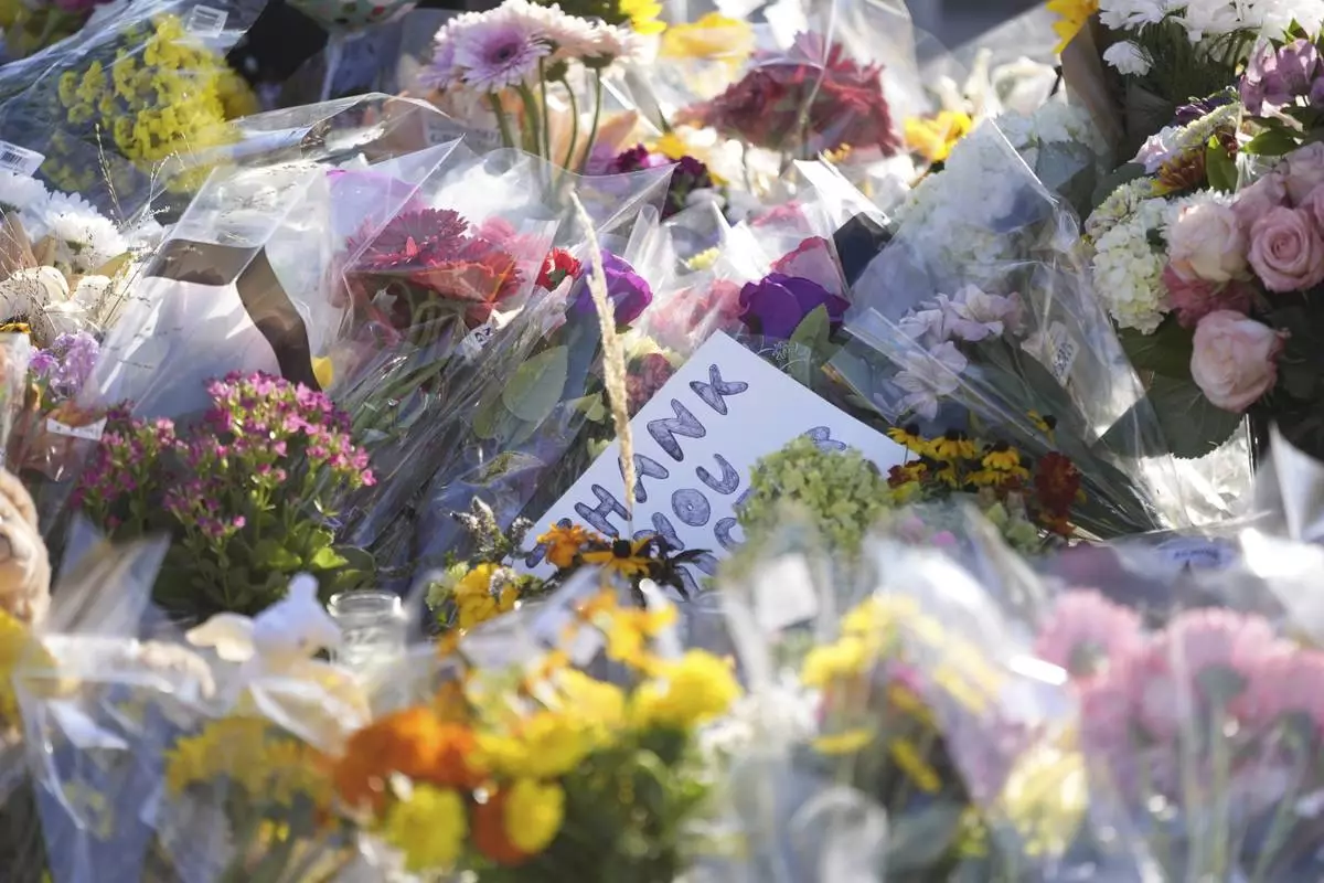 Flowers and notes are placed at a memorial at Annunciation Catholic Church after Wednesday's school shooting, Thursday, Aug. 28, 2025, in Minneapolis. (AP Photo/Abbie Parr)