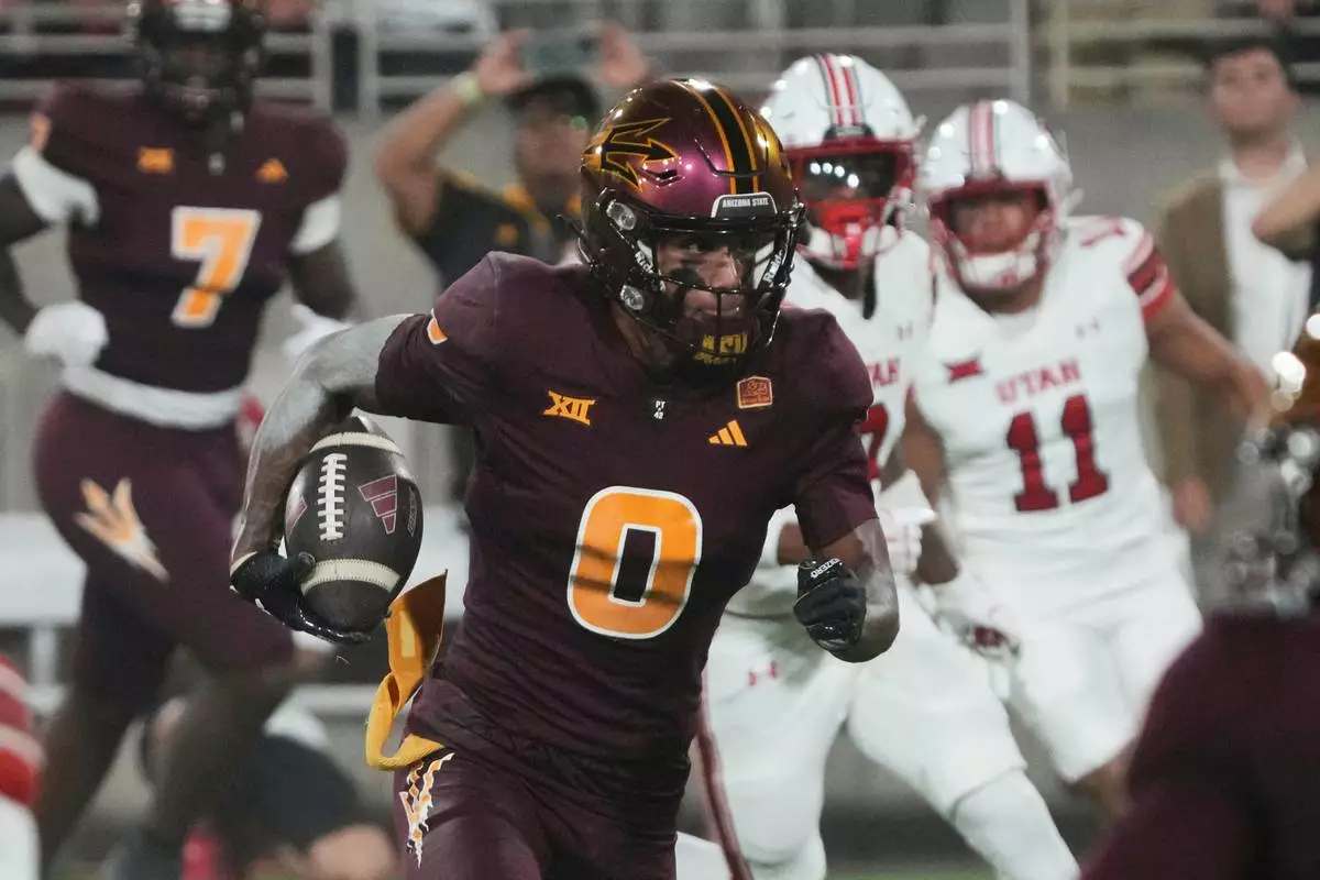 FILE - Arizona State wide receiver Jordyn Tyson (0) carries the ball in the first half during an NCAA college football game against Utah, Friday, Oct. 11, 2024, in Tempe, Ariz. (AP Photo/Rick Scuteri, File)