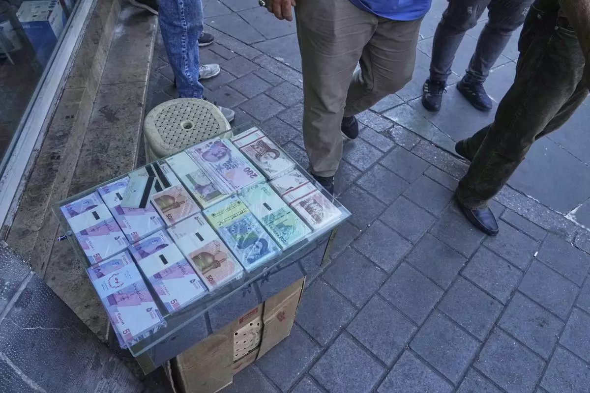 Iranian and foreign banknotes are displayed by a street money exchanger at Ferdowsi square, Tehran's go-to venue for foreign currency exchange, in downtown Tehran, Iran, Thursday, Aug. 28, 2025. (AP Photo/Vahid Salemi)