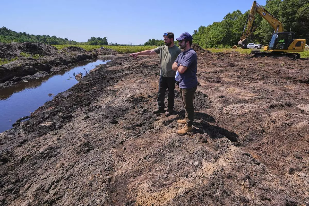 Cranberry grower Jarrod Rhodes points out to engineer Robert Kennedy, right, the path of water flow at a cranberry bog being restored to a natural habitat at the South Meadow Bogs, Thursday, Aug. 7, 2025, in Carver, Mass. (AP Photo/Charles Krupa)