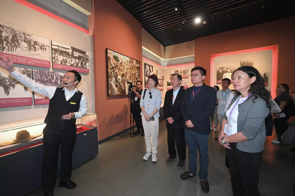 The Working Group on Patriotic Education (WGPE) under the Constitution and Basic Law Promotion Steering Committee organised a two-day study tour yesterday (August 27) and today (August 28), themed around the 80th Anniversary of Victory in the Chinese People's War of Resistance Against Japanese Aggression and the World Anti-Fascist War. Led by the Convenor of the WGPE, Dr Starry Lee, the delegation comprised members of the Media Publicity Sub-group, Mr Lee Luen-fai and Dr James Li; the Director of Information Services, Mrs Apollonia Liu; and 21 representatives from different media organisations. They visited various historical sites and museums in Shenzhen, Dongguan and Guangzhou, with a focus on patriotic devotion to the Chinese nation, gaining a deeper understanding of the gallant efforts of the war martyrs.