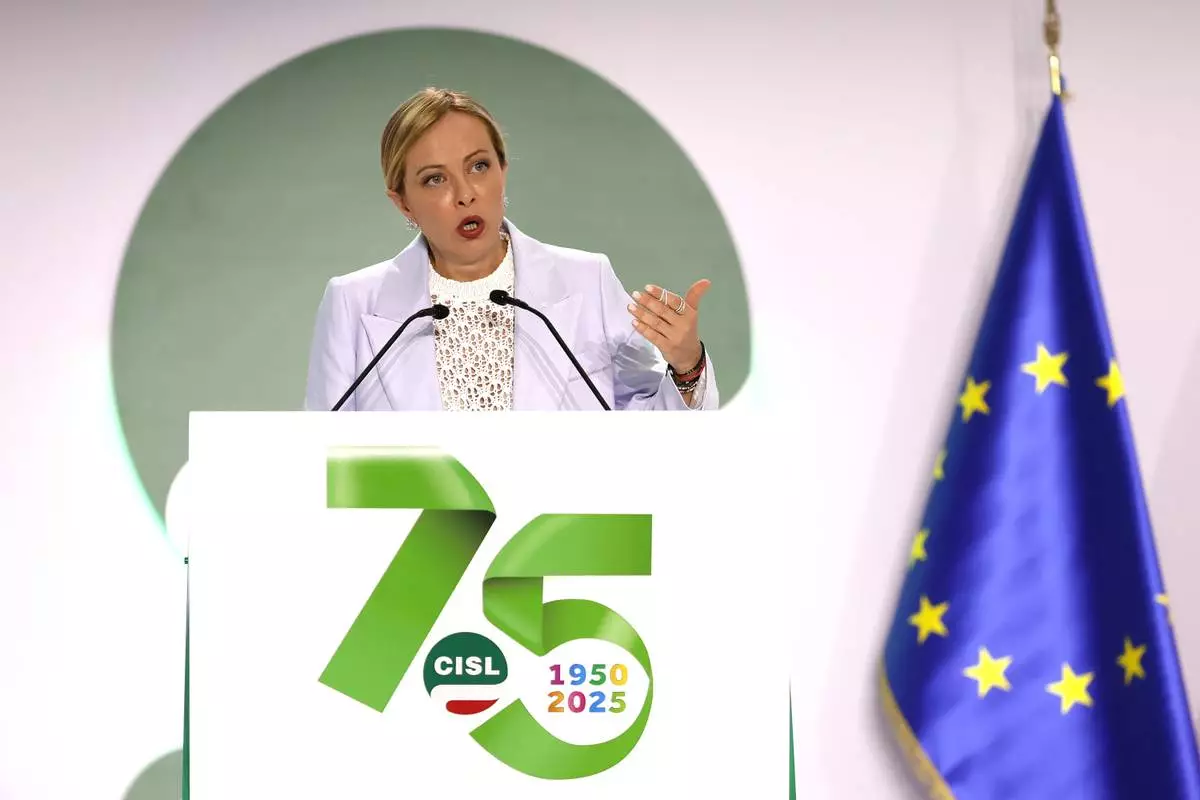 FILE - Italian Premier Giorgia Meloni delivers her speech at the CISL Union meeting in Rome, July 17, 2025. (Cecilia Fabiano/LaPresse via AP, File)