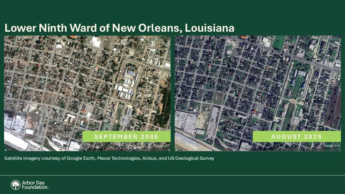 In the two decades since the storm, the Arbor Day Foundation has worked alongside local planting organizations as well as city and state leaders in New Orleans and other impacted communities to help recover tree canopy lost to the hurricane. The Foundation’s most recent planting in February brought dozens of new trees to New Orleans’ Lower Ninth Ward neighborhood. The attached satellite images compare the tree canopy of the Lower Ninth Ward, immediately after Hurricane Katrina to today.
