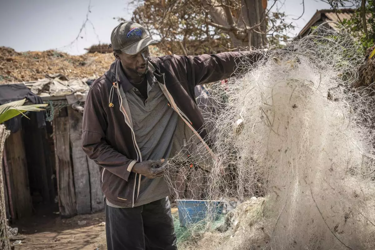Famara Nudure, a fisherman for more than 40 years, inspects what is left of his fishing nets which were damaged at sea by trawlers, in Gunjur, Gambia, on March 23, 2025. (AP Photo/Grace Ekpu)