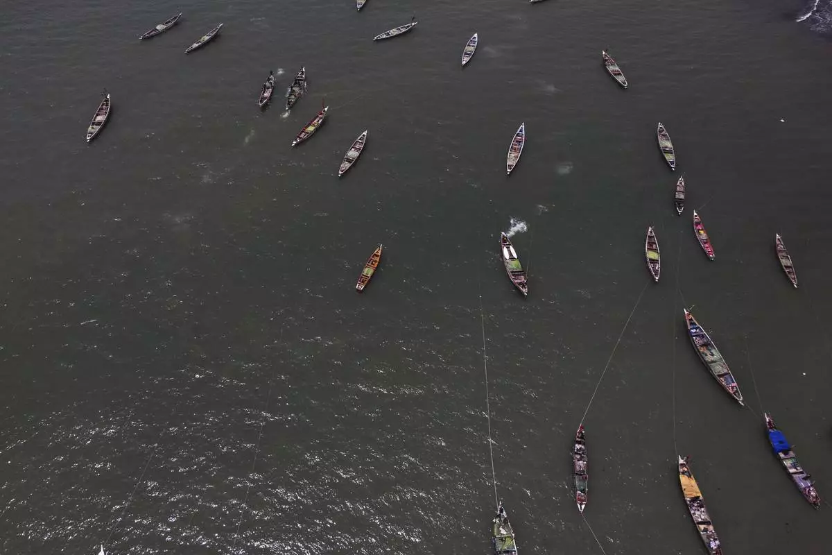 Artisanal fishing boats sit in the water outside the fish landing site in Tanji, Gambia, on March 25, 2025. (AP Photo/Grace Ekpu)