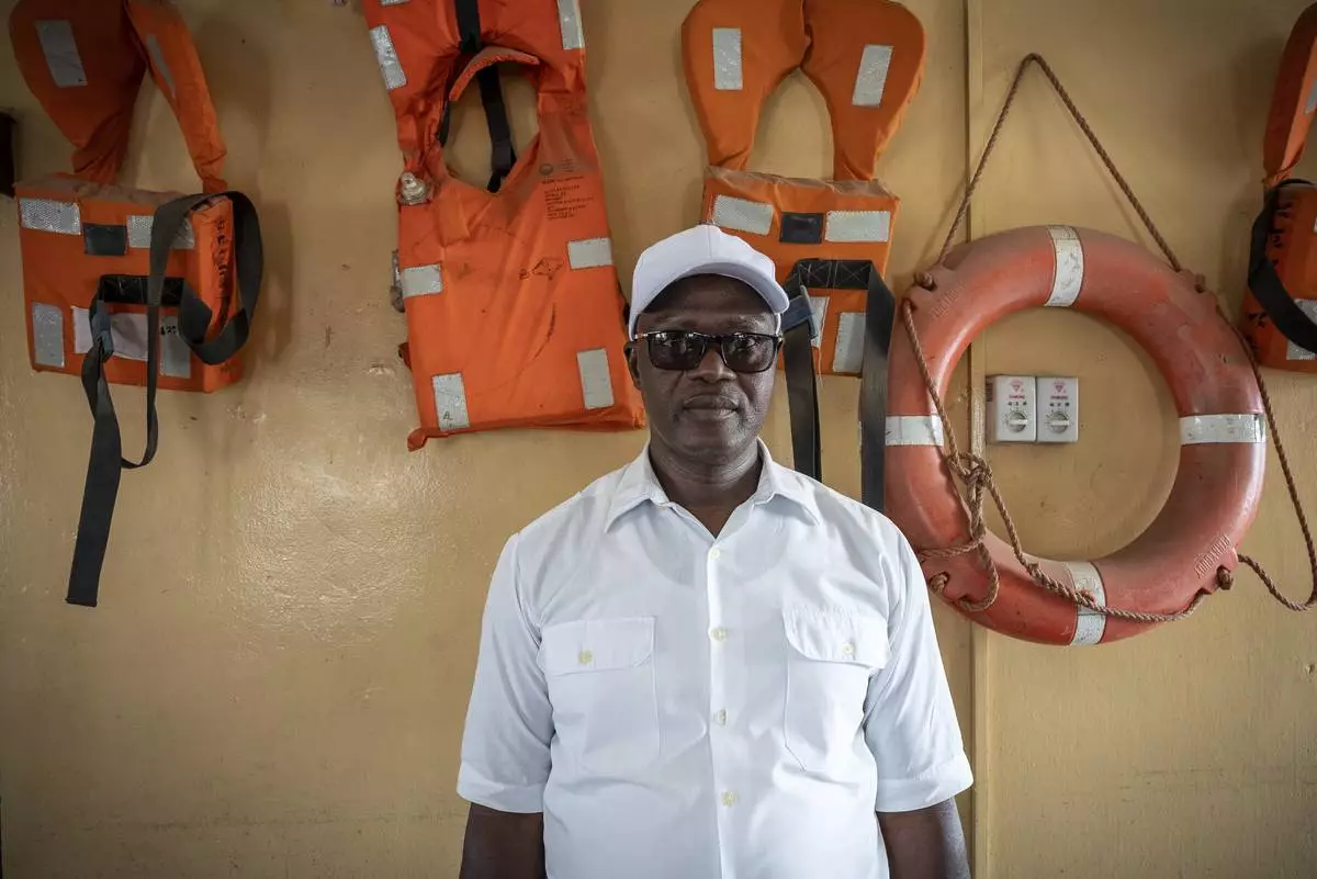 Abdou Sanyang, secretary general of the Association of Gambia Sailors, stands for a portrait in his office in Banjul, Gambia, on March 24, 2025. (AP Photo/Grace Ekpu)