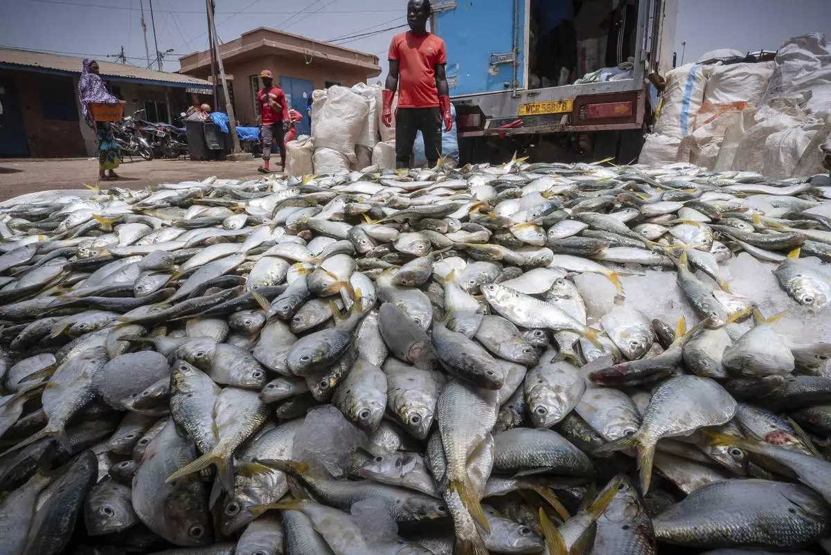 Workers gather freshly caught fish at the fish landing site in Tanji, Gambia, on March 25, 2025. (AP Photo/Grace Ekpu)
