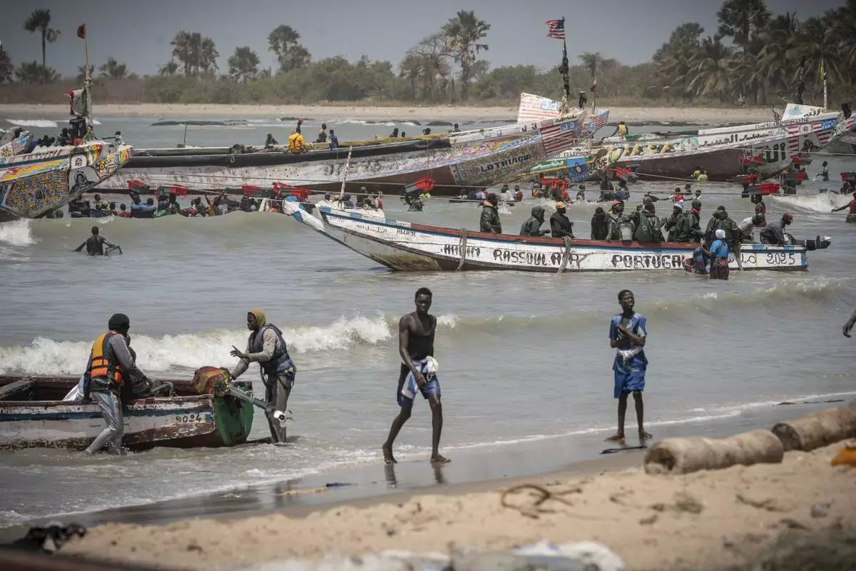 Artisanal fishermen head out to fish in their boats at dusk from Brufut beach, Gambia, on March 25, 2025. (AP Photo/Grace Ekpu)
