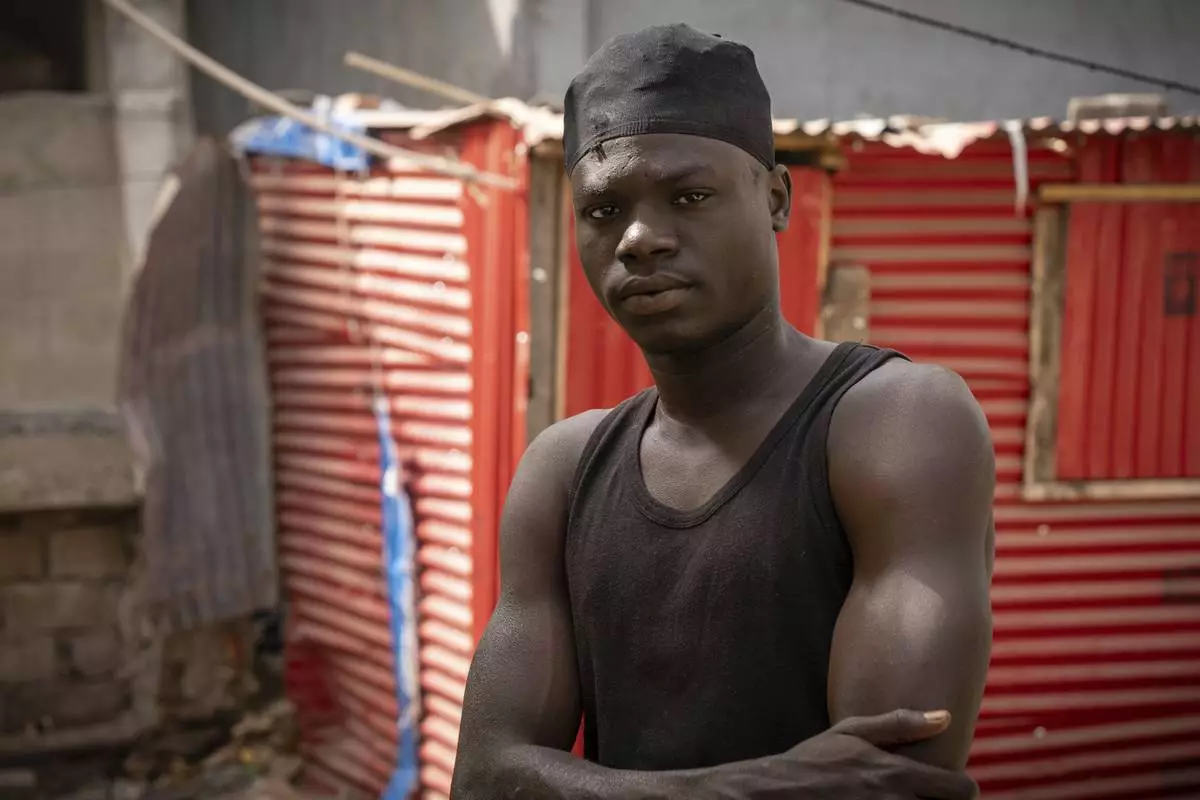 Kawsu Leigh, a fisherman who was injured in a seabound arson attack, stands for a portrait at his home in Banjul, Gambia, on March 25, 2025, almost a year after an attack on the foreign-owned vessel Abu Islam where he was working. (AP Photo/Grace Ekpu)