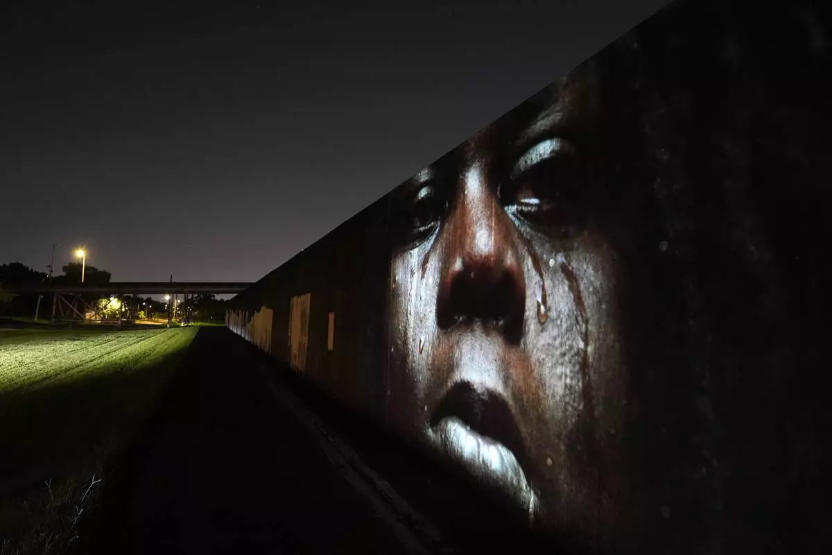 This photo of Leonard Thomas, 23, crying in the aftermath of Hurricane Katrina in New Orleans, taken by AP photographer Rick Bowmer, is projected Wednesday, Aug. 13, 2025, onto the flood wall in the Lower Ninth Ward, which was breached, flooding major parts of the city. (AP Photo/Gerald Herbert)
