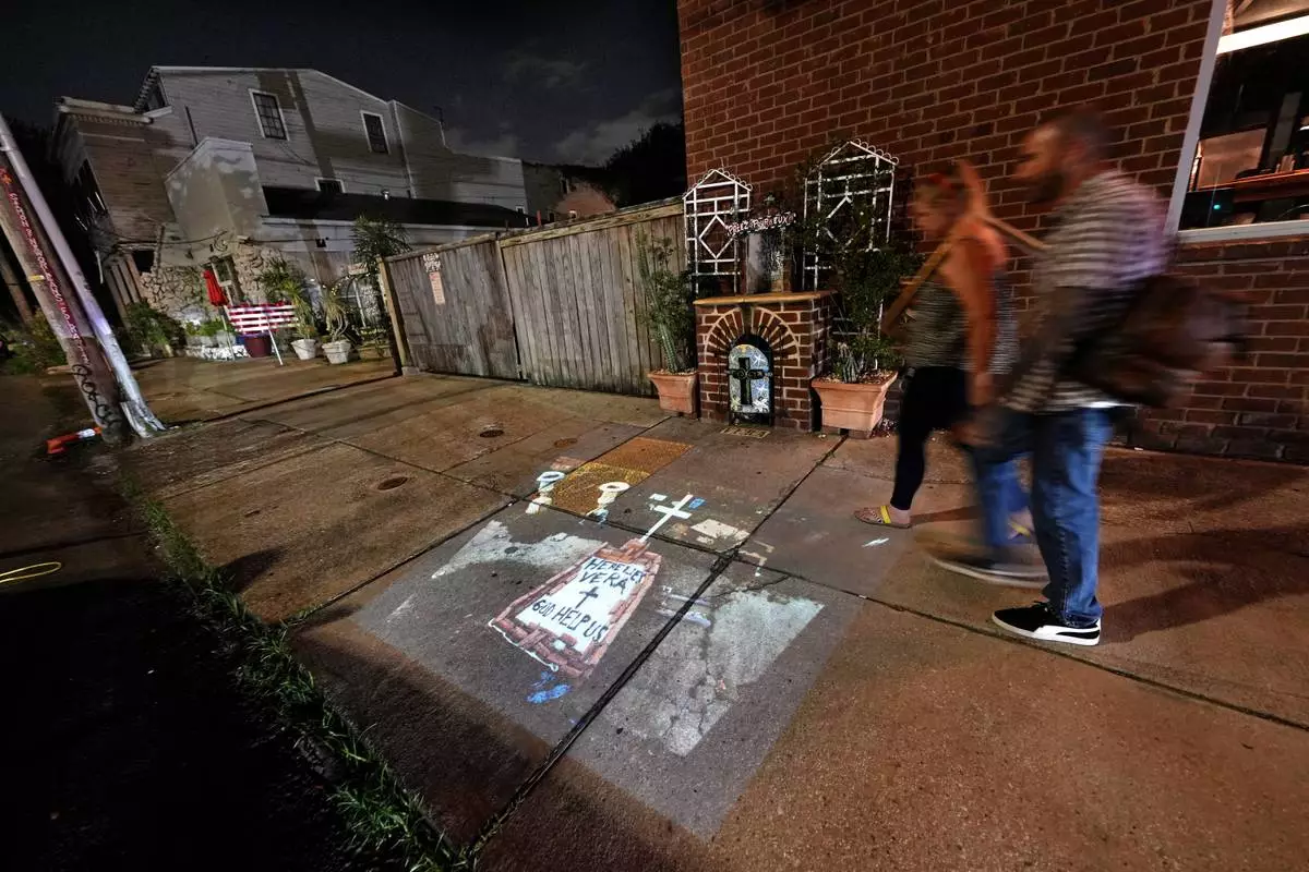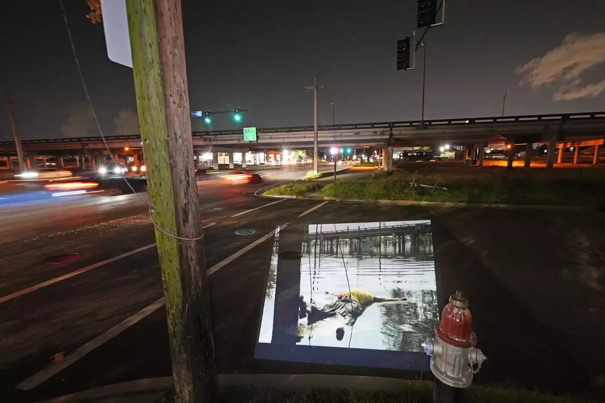 This photo of a makeshift tomb at a New Orleans street corner, concealing a body that had been lying on the sidewalk for days in the wake of Hurricane Katrina, taken by AP photographer Dave Martin, is projected onto the same sidewalk Tuesday, Aug. 19, 2025, in New Orleans. (AP Photo/Gerald Herbert)