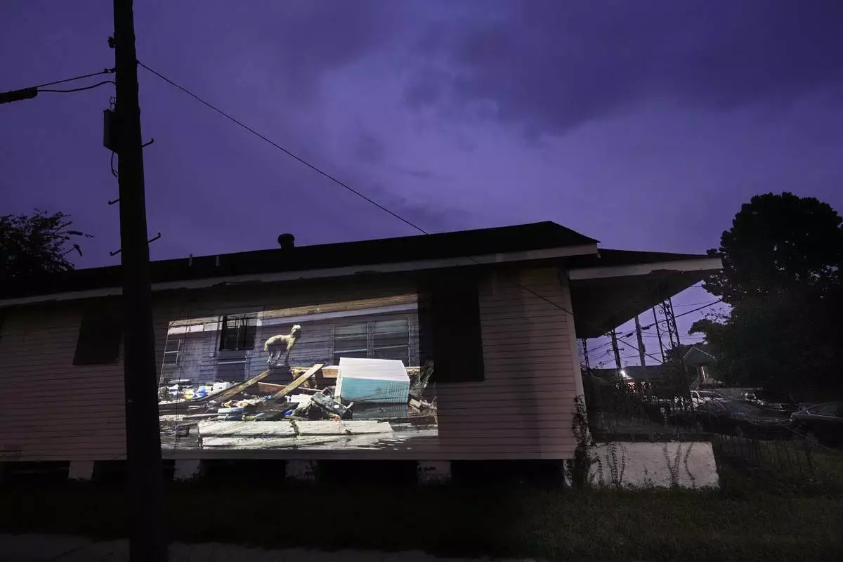 This photo of a poodle perching itself precariously upon a pile of trash while surrounded by floodwaters in the aftermath of Hurricane Katrina in New Orleans, taken by AP photographer Rick Bowmer, is projected Thursday, Aug. 21, 2025, onto a house in a neighborhood that was flooded by the storm. (AP Photo/Gerald Herbert)