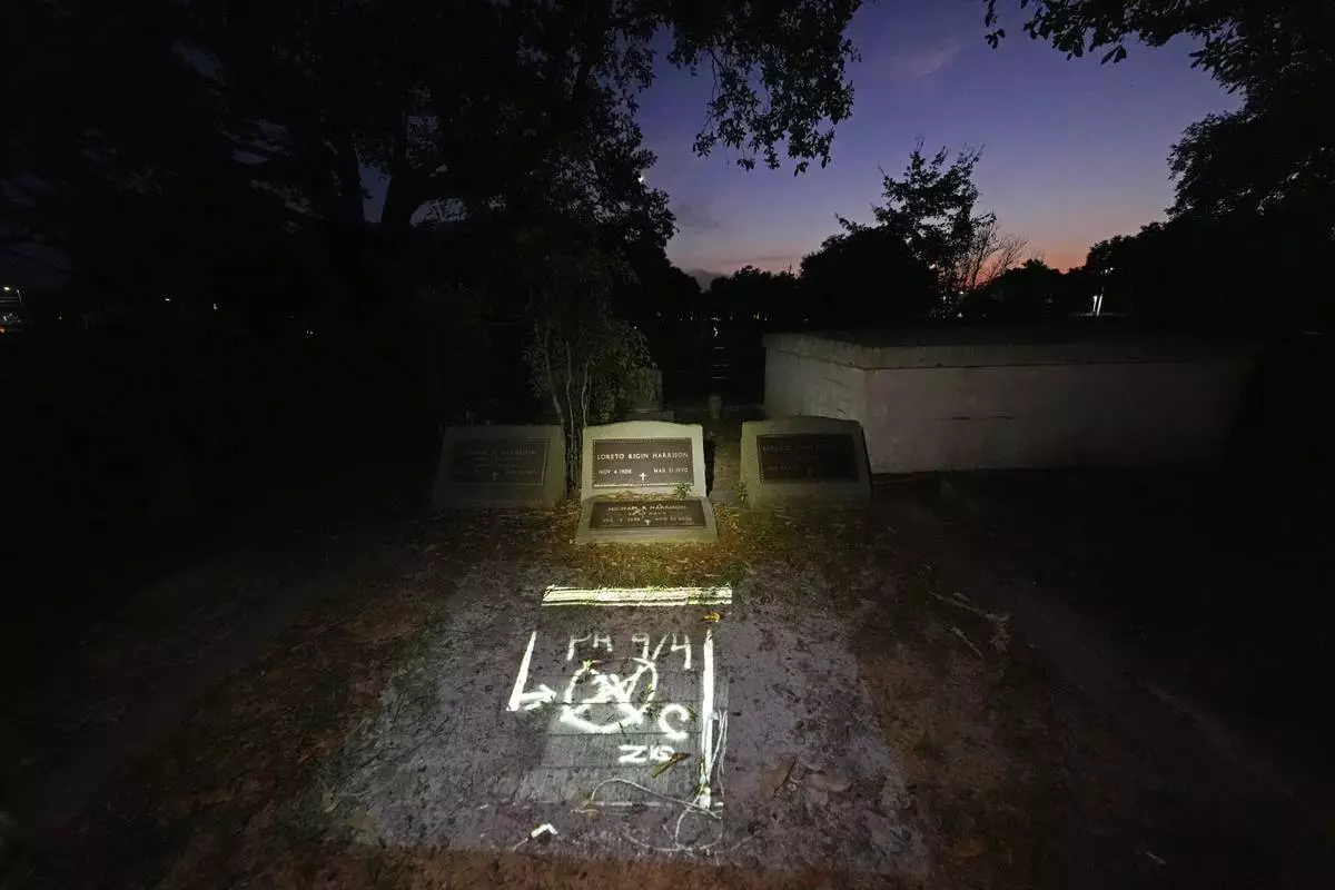 This photo of the FEMA markings indicating a deceased victim in the home of Michael Harrison, who died inside during Hurricane Katrina in Bay St. Louis, Miss., taken by AP photographer Gerald Herbert, nephew of Harrison, is projected Tuesday, Aug. 26, 2025, onto his grave in Pass Christian, Miss. (AP Photo/Gerald Herbert)
