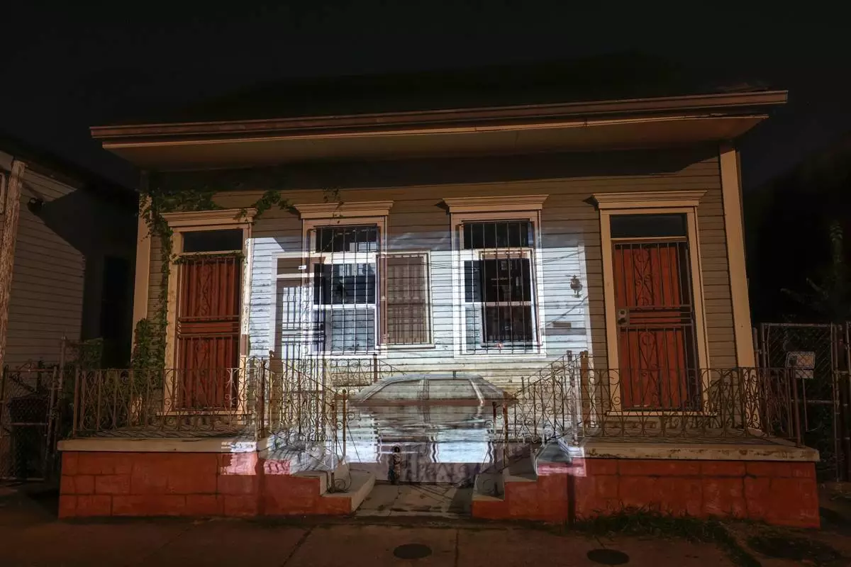 This photo of receding floodwaters leaving their mark on a house and automobile on Orleans Avenue in the aftermath of Hurricane Katrina in New Orleans, taken by AP photographer Ric Francis, is projected Wednesday, Aug. 20, 2025, onto the same house. (AP Photo/Gerald Herbert)
