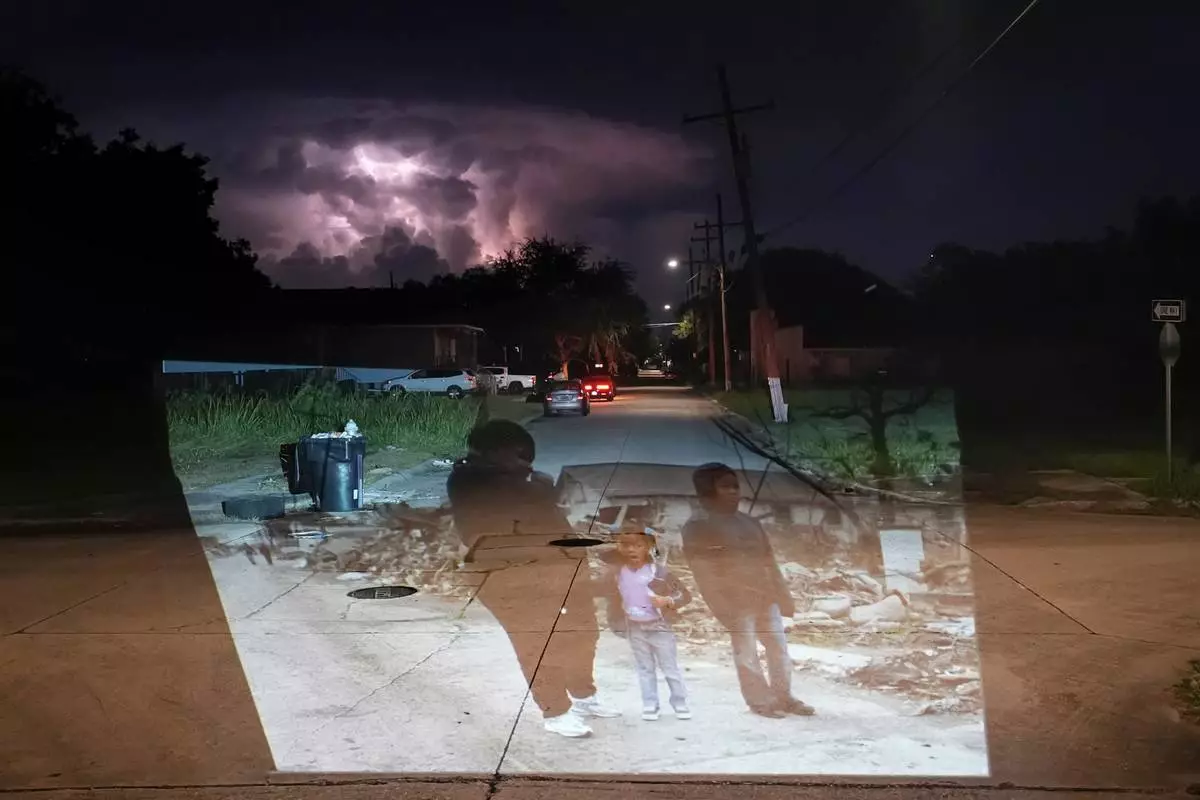 This photo of Valerie Thomas and her nieces Shante Fletcher, 6, and Sarine Fletcher, 11, viewing the destruction of her brother’s home in the aftermath of Hurricane Katrina in the Lower Ninth Ward of New Orleans, taken by AP photographer Gerald Herbert, is projected Wednesday, Aug. 13, 2025, onto the same block, while a heat lightning storm illuminates the clouds. (AP Photo/Gerald Herbert)