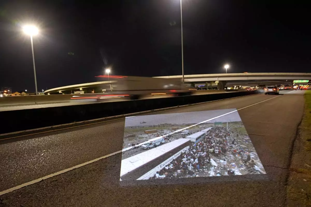 This photo showing throngs of New Orleans residents gathering at a evacuation staging area along Interstate 10 in Metairie, La., in the aftermath of Hurricane Katrina, taken by AP photographer Dave Martin, is projected Wednesday, Aug. 20, 2025, onto the same roadway. (AP Photo/Gerald Herbert)