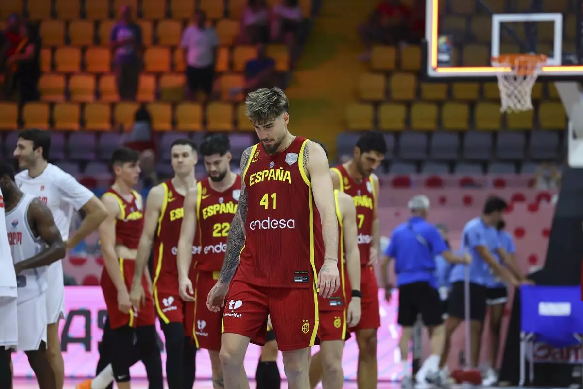 Spain's Juancho Hernangómez walks onto the court with teammates after loosing to Georgia during the EuroBasket, European Basketball Championship Group C match at the Spyros Kyprianou Arena in Limassol, Cyprus, Thursday, Aug. 28, 2025. (AP Photo/Chara Savvidou)