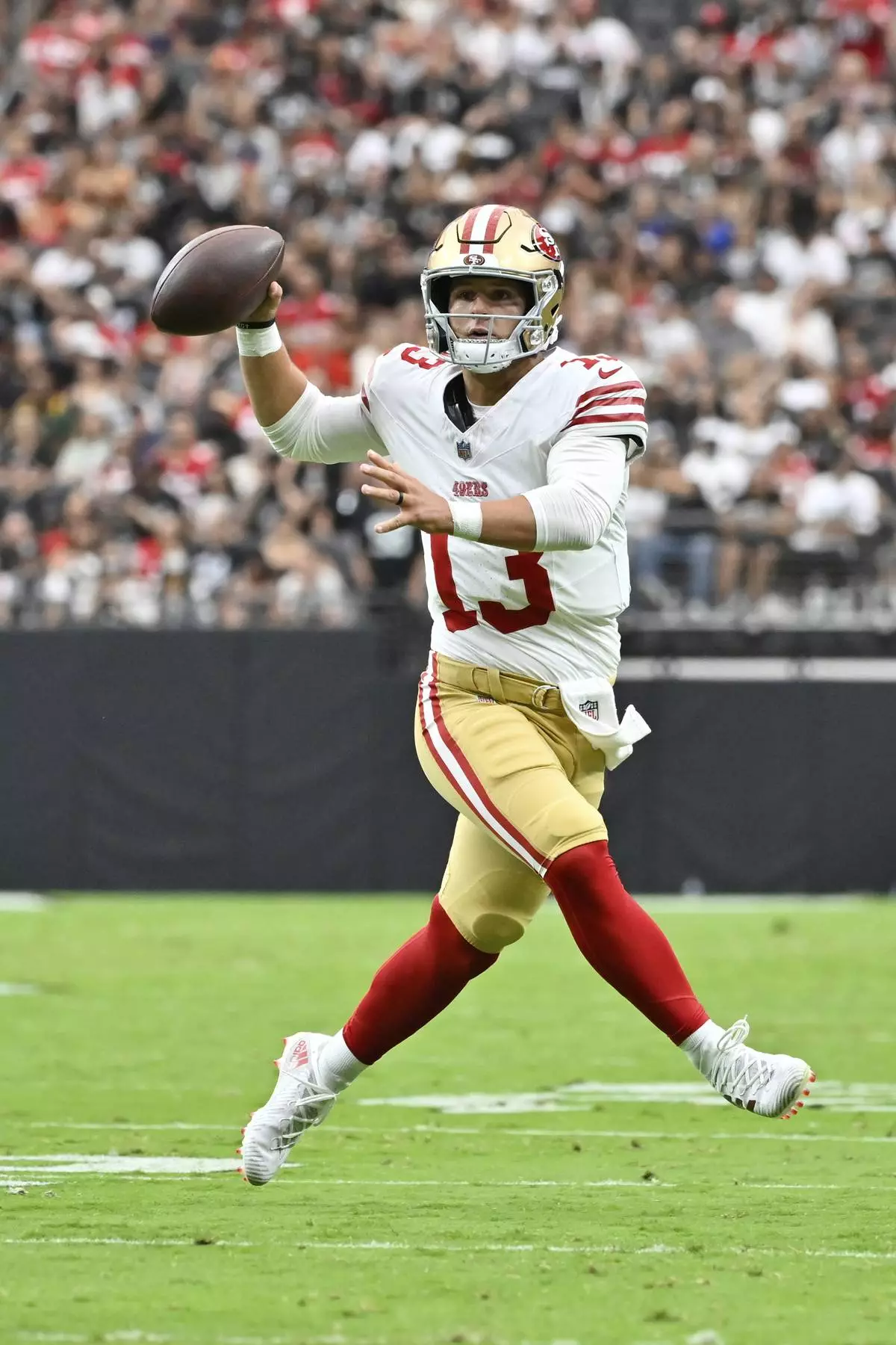 San Francisco 49ers quarterback Brock Purdy (13) rolls out during the first half of a preseason NFL football game against the Las Vegas Raiders, Saturday, Aug. 16, 2025, in Las Vegas. (AP Photo/David Becker)