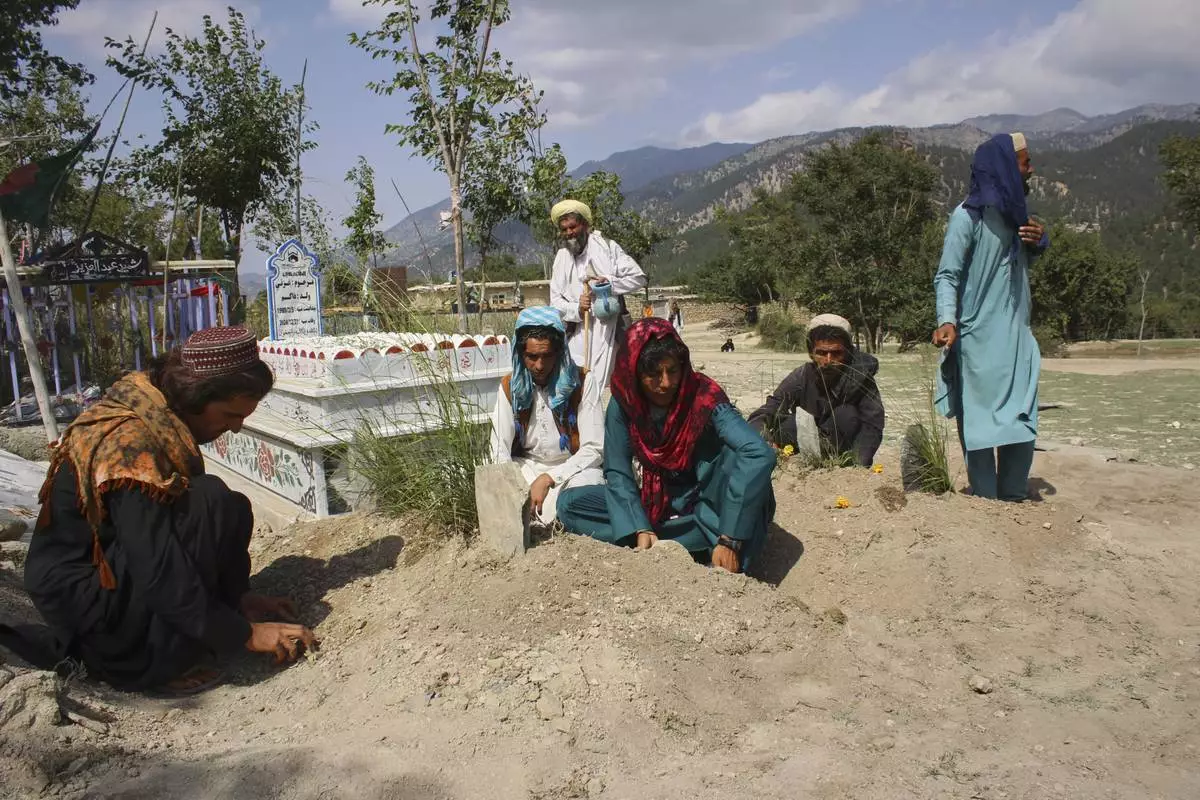 THIS CORRECTS THE CASUALTY FIGURES AS PROVIDED BY AFGHAN OFFICIALS - Relatives sit at the graves of children allegedly killed in what Taliban authorities said was a Pakistani drone attack, in Spera district of Khost province, Afghanistan, Thursday, Aug. 28, 2025. (AP Photo/Saifullah Zahir)