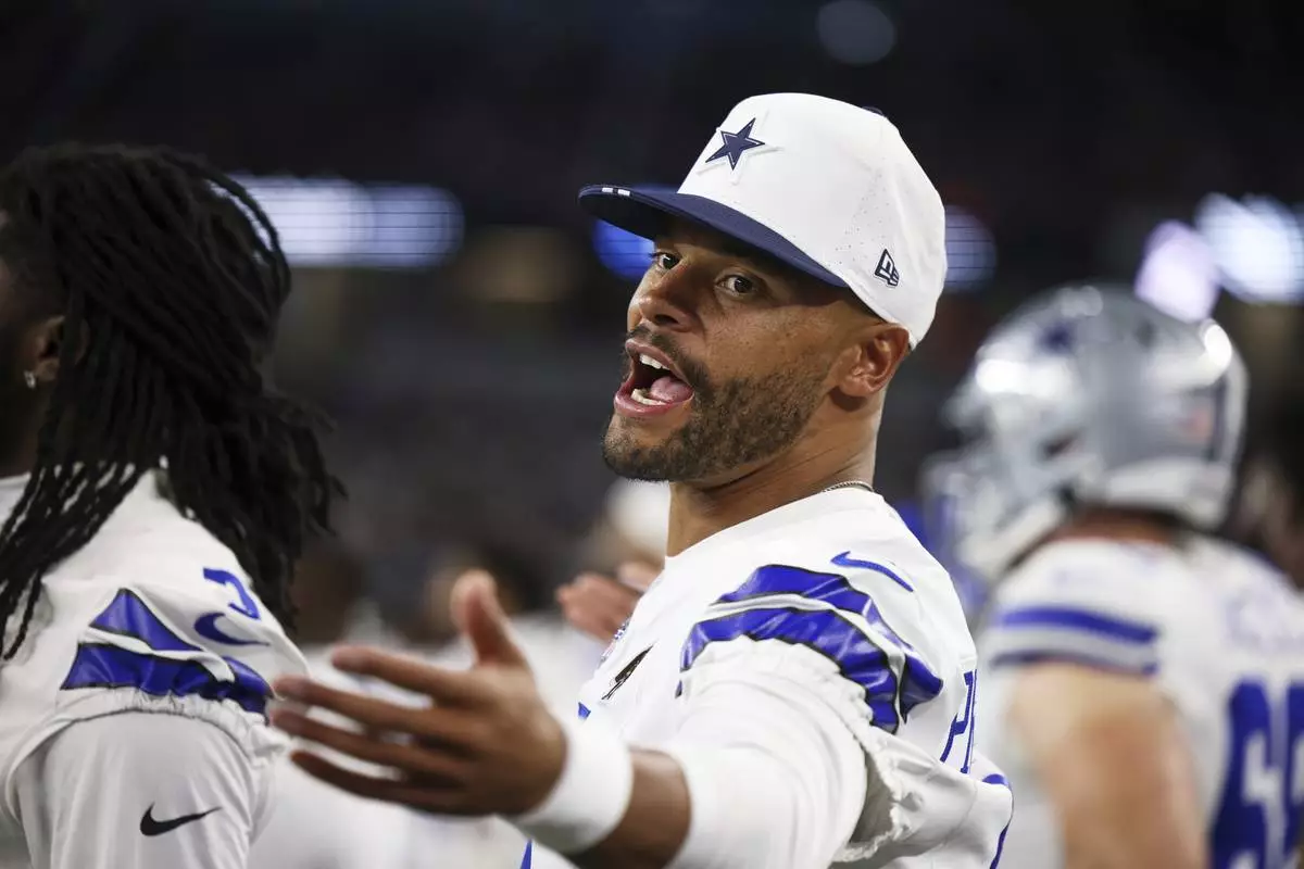 Dallas Cowboys quarterback Dak Prescott talks with teammates on the sideline in the second half of a preseason NFL football game against the Baltimore Ravens Saturday, Aug. 16, 2025, in Arlington, Texas. (AP Photo/Gareth Patterson)