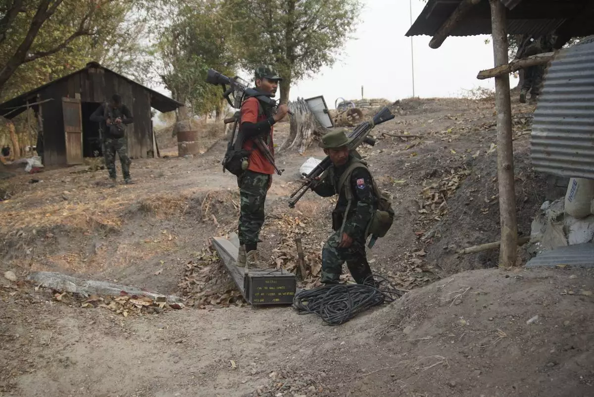 FILE - Members of the Karen National Liberation Army and People's Defense Force collect weapons after they captured an army outpost, in the southern part of Myawaddy township in Kayin state, Myanmar, March 11, 2024. (AP Photo/METRO)